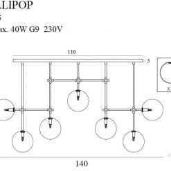 Przepiękna lampa z rodziny Lollipop, która idealnie wpasuje się w nowoczesne jak i klasyczne wnętrza. Imponująca, niemal półtorametrowa oprawa na podłużnej ramie o ciekawym kształcie. Mosiężne pręty, na których osadzone są sferyczne szklane klosze z żarówkami, można dowolnie regulować, dzięki czemu kształt lampy można dostosować do swoich potrzeb. Jej forma pozwala na uzyskanie ogromnej ilości rozproszonego światła.