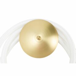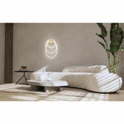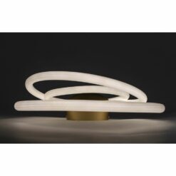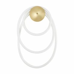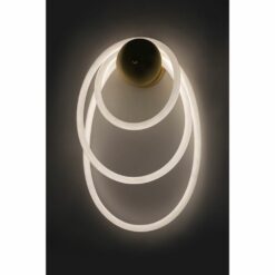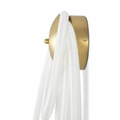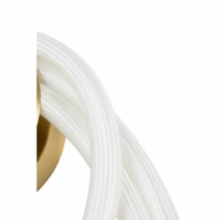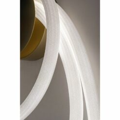 Metalowa elementy w kolorze złotym, przepleciona elastycznym “wężem” w oplocie z tkaniny, skrywa w sobie ledowe źródło światła, tworząc nie tylko efektowne oświetlenie, ale również będąc dekoracyjnym elementem na ścianie.