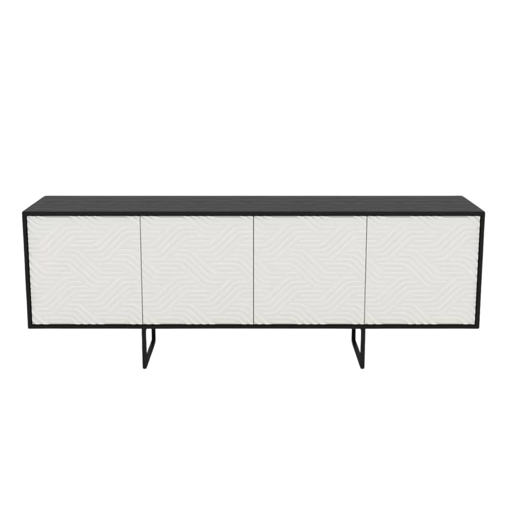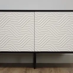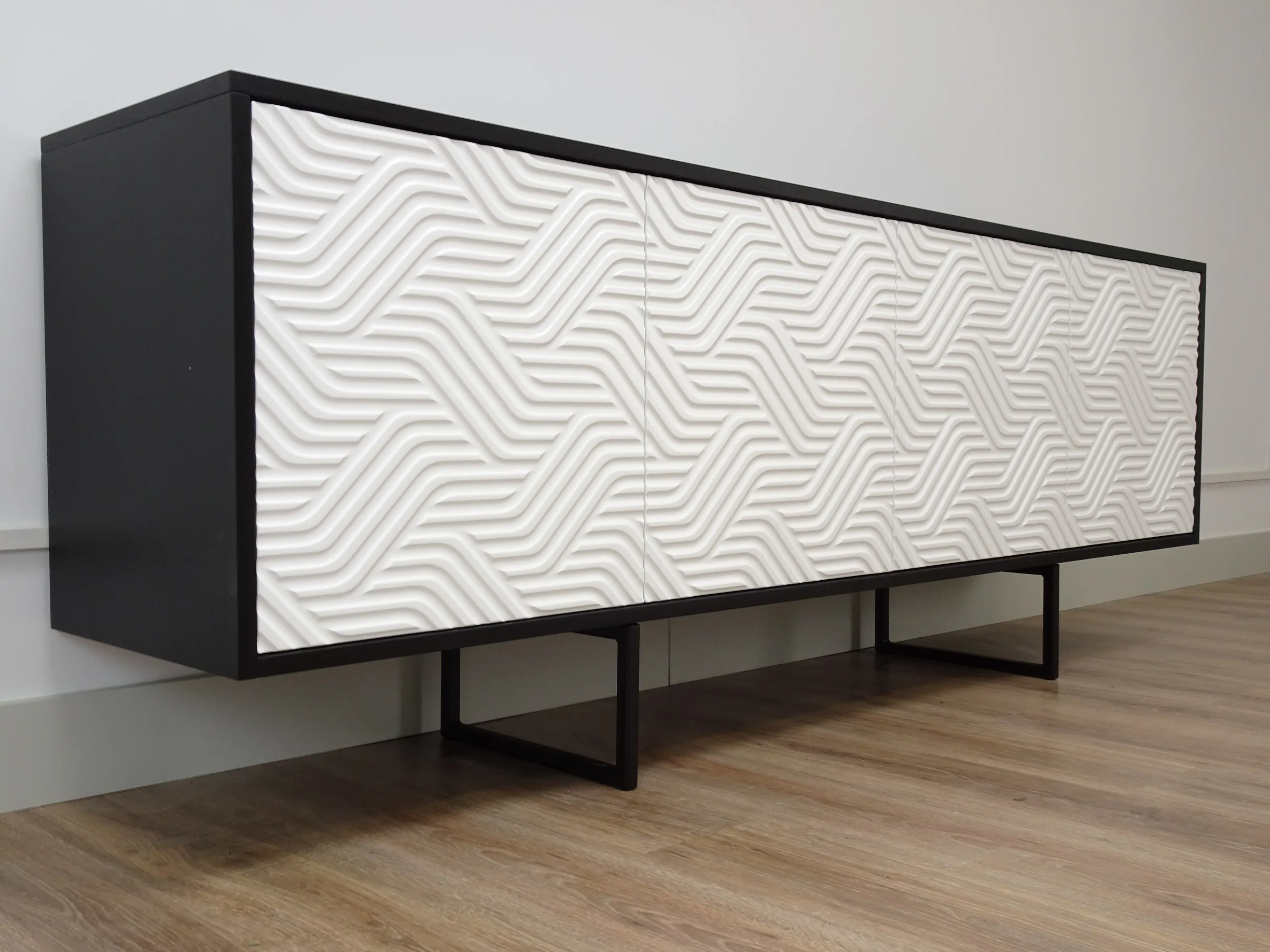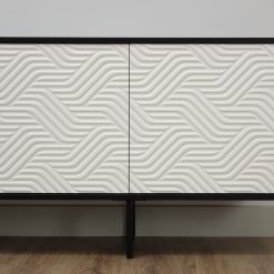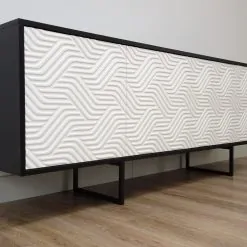 Designerska komoda ABATO ZigZag , wykończona jest naturalnym fornirem dębowym barwionym na czarno , który pokryty jest matowym lakierem akrylowym. Fronty wykonane są z płyty MDF co pozwoliło nam stworzyć piękny wzór 3D , co czyni ją niepowtarzalną. Fronty pokryliśmy białym lakierem matowym.