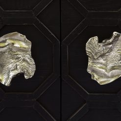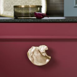 Mosiężny uchwyt meblowy o abstrakcyjnym charakterze i nieregularnej strukturze, wytwarzany tradycyjną technologią odlewniczą w Polsce.