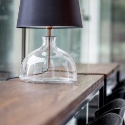Podstawa lampy wykonana ze szkła ręcznie formowanego, transparentnego.