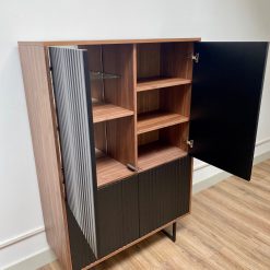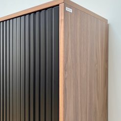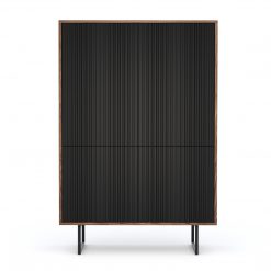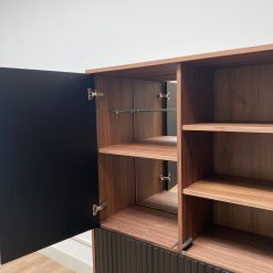 Designerska komoda ABATO , wykończona jest naturalnym fornirem orzech amerykański , który pokryty jest matowym lakierem akrylowym. Fronty wykonane są z płyty MDF co pozwoliło nam stworzyć piękny wzór 3D , co czyni ją niepowtarzalną. Fronty również pokryliśmy lakierem matowym.