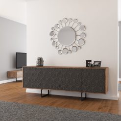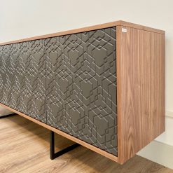 Designerska komoda ABATO FX, wykończona naturalnym fornirem z orzecha amerykańskiego, pokrytym matowym lakierem akrylowym. Fronty wykonane są z płyty MDF, co pozwoliło nam stworzyć piękny trójwymiarowy wzór zachodzących na siebie sześciokątów, co czyni go wyjątkowym
