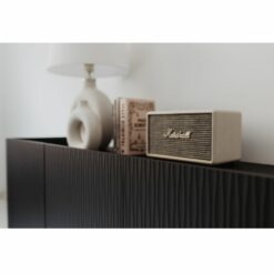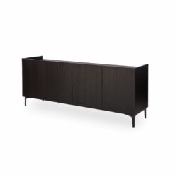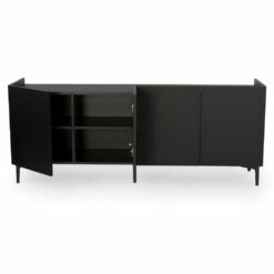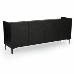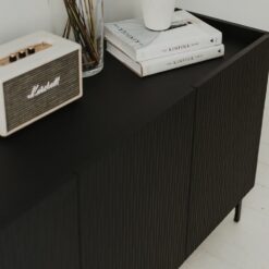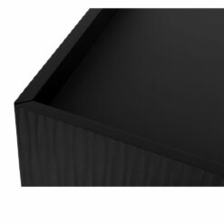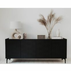 Komoda BOLGE to masywny mebel, który został wykonany z czarnej płyty Kronospan. Dzięki wykończeniu frontów w kształcie fali (MDF Finsa Mojave) światło załamuje się i tworzy niepowtarzalny efekt. Komoda posiada delikatnie uniesione fronty i boki. Blat wykonany jest z czarnej płyty FORBO. Nogi mebla są czarne, metalowe, o wysokości 12 cm. Komoda Bolge dostępna jest w trzech rozmiarach.