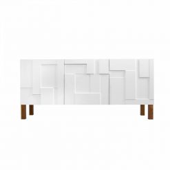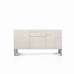 Komoda Klere L wyposażona jest w dwie szuflady i dwa skrzydła otwierane na bok. Pojemne wnętrze jest bardzo praktyczne, gdyż pozwala zachować porządek i wygodnie przechowywać różnego rodzaju przedmioty. Dzięki oryginalnej formie mebel może stać się przykuwającym wzrok elementem dekoracyjnym. Prostopadłościenna bryła nabiera dynamizmu i wyrazistości za sprawą niezwykłych, trójwymiarowych frontów. Elementy o różnej grubości tworzą intrygującą grę światła i cienia.