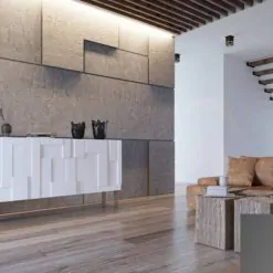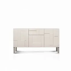 Komoda Klere L wyposażona jest w dwie szuflady i dwa skrzydła otwierane na bok. Pojemne wnętrze jest bardzo praktyczne, gdyż pozwala zachować porządek i wygodnie przechowywać różnego rodzaju przedmioty. Dzięki oryginalnej formie mebel może stać się przykuwającym wzrok elementem dekoracyjnym. Prostopadłościenna bryła nabiera dynamizmu i wyrazistości za sprawą niezwykłych, trójwymiarowych frontów. Elementy o różnej grubości tworzą intrygującą grę światła i cienia.