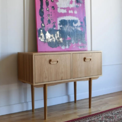 Mebel nie musi być szalenie dekoracyjny, by przyciągać spojrzenie. Prostota także jest atrakcyjna, szczególnie jeśli przybiera tak wyrafinowaną formę, jaką posiada komoda Cern. Składają się na nią dwie głębokie szuflady na wysokość całego mebla. Wszystkie posiadają frezowane uchwyty. Całość spoczywa na prosto zamontowanych, walcowatych nogach. Wspomniane detale były popularne w latach 50. i 60. ubiegłego wieku, a ponieważ stylistyka retro jest nam szczególnie bliska, czerpiemy z niej garściami.
