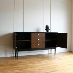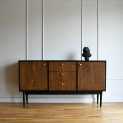 Czerń i ciemne drewno spotykają się w formie klasycznej komody z nowoczesnym twistem. Mosiężne gałki dodają jej subtelnego blasku, a symetryczny układ frontów – harmonii.
