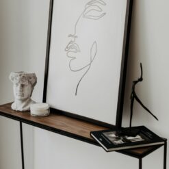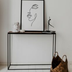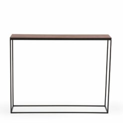 STAM 200 to minimalistyczna konsola z pojedynczym blatem osadzonym na metalowej ramie malowanej proszkowo na kolor czarny. Blat wykonany jest z forniru dębowego.