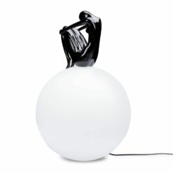 Duży okrągły biały klosz wykonany z polipropylenu zapewnia równomierne i przyjemne rozproszenie światła, postać kobiety wykonana jest z żywicy.