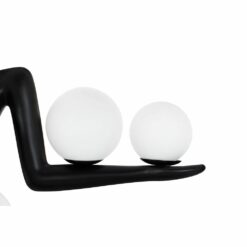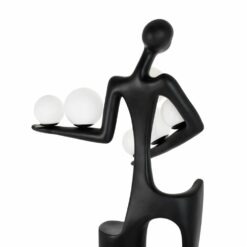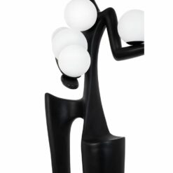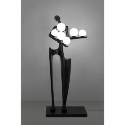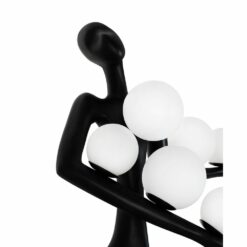 • Geometryczna Postać z Sześcioma Kloszami: Niezwykła, geometryczna postać utrzymuje w rękach sześć mlecznych kloszy z polipropylenu, w różnych rozmiarach, tworząc oryginalny efekt wizualny. Każdy klosz delikatnie rozprasza światło, tworząc ciepłą i przytulną atmosferę.