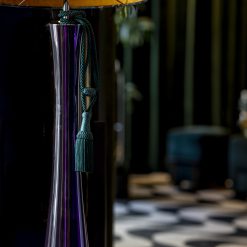 Podstawa lampy wykonana z bezbarwnego, ręcznie formowanego szkła, a następnie malowana transparentną, fioletową farbą.