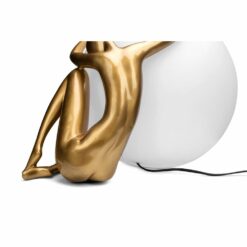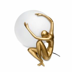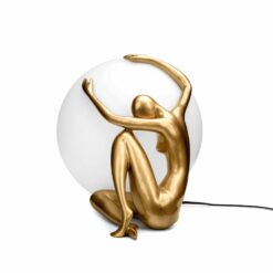Duży okrągły biały klosz wykonany z polipropylenu zapewnia równomierne i przyjemne rozproszenie światła, postać kobiety wykonana jest z żywicy.