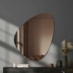 Eleganckie brązowe lustro o nieregularnym obłym kształcie.