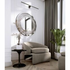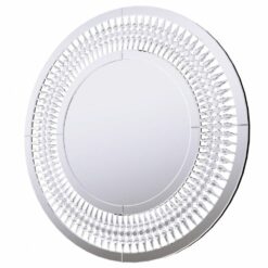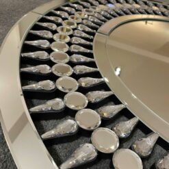 Lustro w rozmiarze 90x90cm (wymiar zewnętrzny czyli razem z ramą). Lustro okrągłe w dekoracyjnej ramie wykonanej z kryształków. Idealnie wpisze się w wnętrza w stylu nowoczesnym, glamour. Tafla lustra umieszczona jest na płycie MDF.