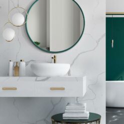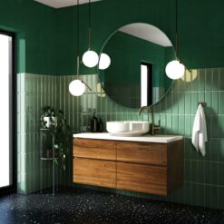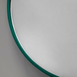 - Cienka, 10-milimetrowa rama wykonana jest z wodoodpornej płyty MDF lakierowanej na kolor zielony twardym metalicznym lakierem poliuretanowym, wykończenie matowe. Lustrzaną taflę wklejono, bez naruszenia powłok lakierniczych (bez blaszek czy gwoździ), co zapewnia wodoszczelność oprawy na lata. Rama nadaje się do łazienki.
