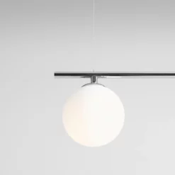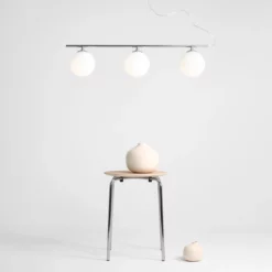 Nowoczesna lampa wisząca o minimalistycznym designie i starannym wykończeniu z nutą glamour. Matowe, opalowe klosze równomiernie i subtelnie rozświetlą przestrzeń nad stołem w jadalni lub salonie.