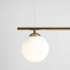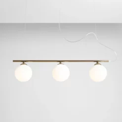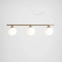 Nowoczesna lampa wisząca o minimalistycznym designie i starannym wykończeniu z nutą glamour. Matowe, opalowe klosze równomiernie i subtelnie rozświetlą przestrzeń nad stołem w jadalni lub salonie.