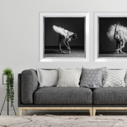 Na ciemno-szarym tle, widoczne zdjęcie baletnicy w białej sukience. Jedna noga wyprostowana, druga lekko ugięta, wzdłuż niej pochylona sylwetka baletnicy, prawą ręką dotyka baletki. Jedna stopa przywiera do powierzchni, druga wspina się na palcach. Włosy baletnicy upięte w kok. Piękne, artystyczne zdjęcie w minimalistycznej tonacji. Dla osób, ceniących elegancję, prostotę i wynikający z niej artyzm. Obraz sprawdzi się w salonie. Zdjęcie oprawione w szeroką ramę, biały połysk, wykończoną srebrną listwą od środka.