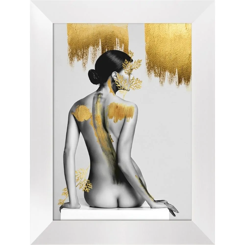 Zdjęcie nagiej, siedzącej kobiety, odwróconej tyłem z elementami złotej kolorystyki.