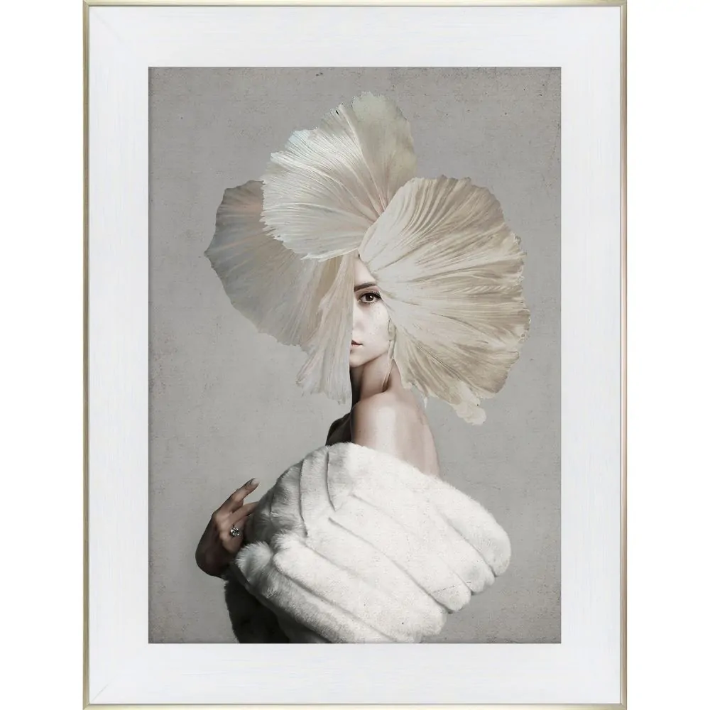 Zmysłowa fotografia kobiety stojącej bokiem z twarzą skierowaną na widza z białym futrem na nagich ramionach. Twarz ma przysłoniętą perłowymi płatkami kwiatów.