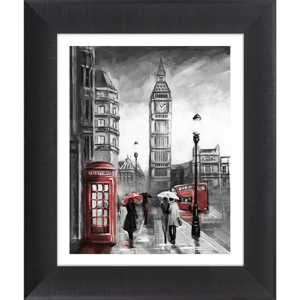 Obraz jednej z ulic w Londynie z charakterystycznymi detalami.