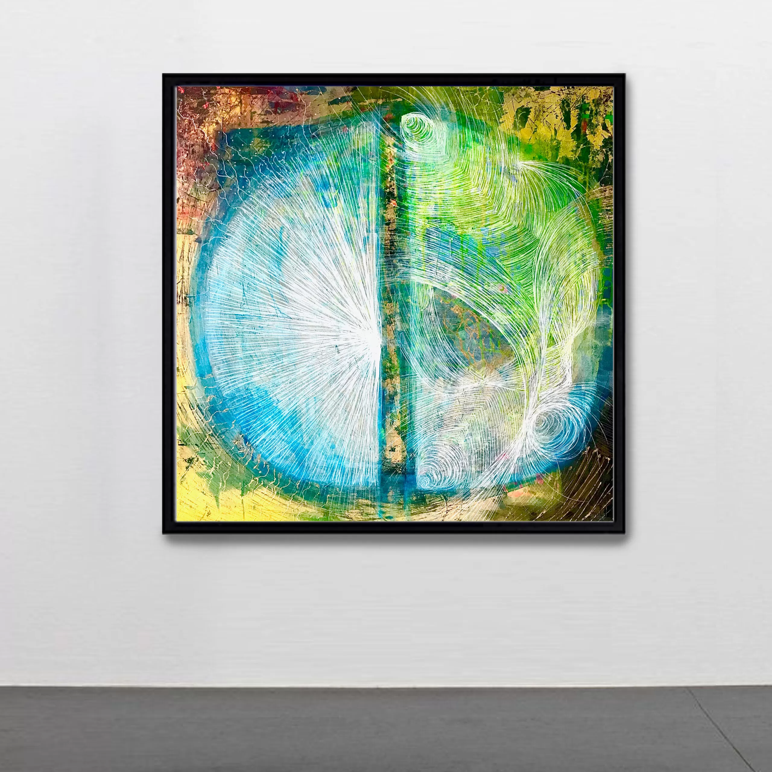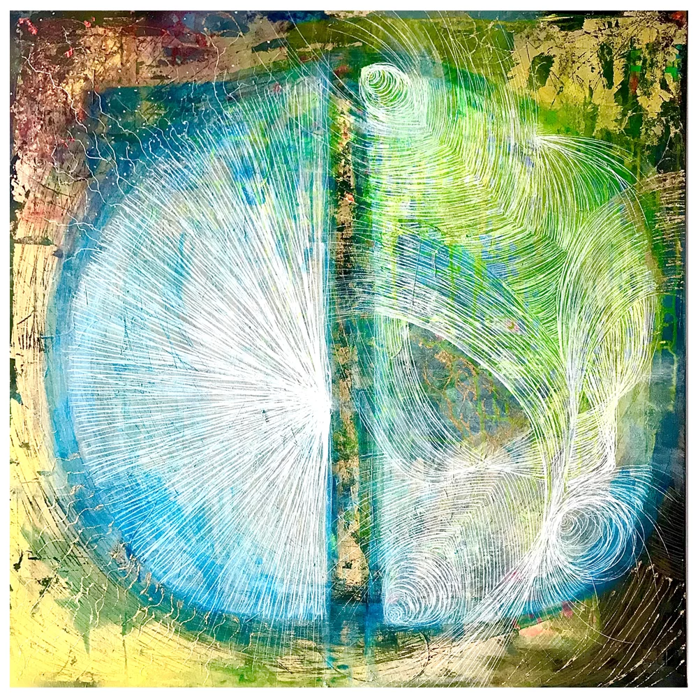 Obraz na płótnie, akryl, spray, pozłotnictwo, techniki własne.
