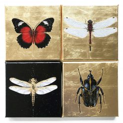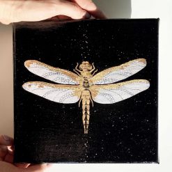 | “Ważka” z cyklu “Bugs”. Obraz malowany akrylem z dodatkiem szlagmetalu na płótnie. Farba nakładana warstwowo. Całość pokryta błyszczącym werniksem do pozłoty. |