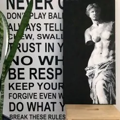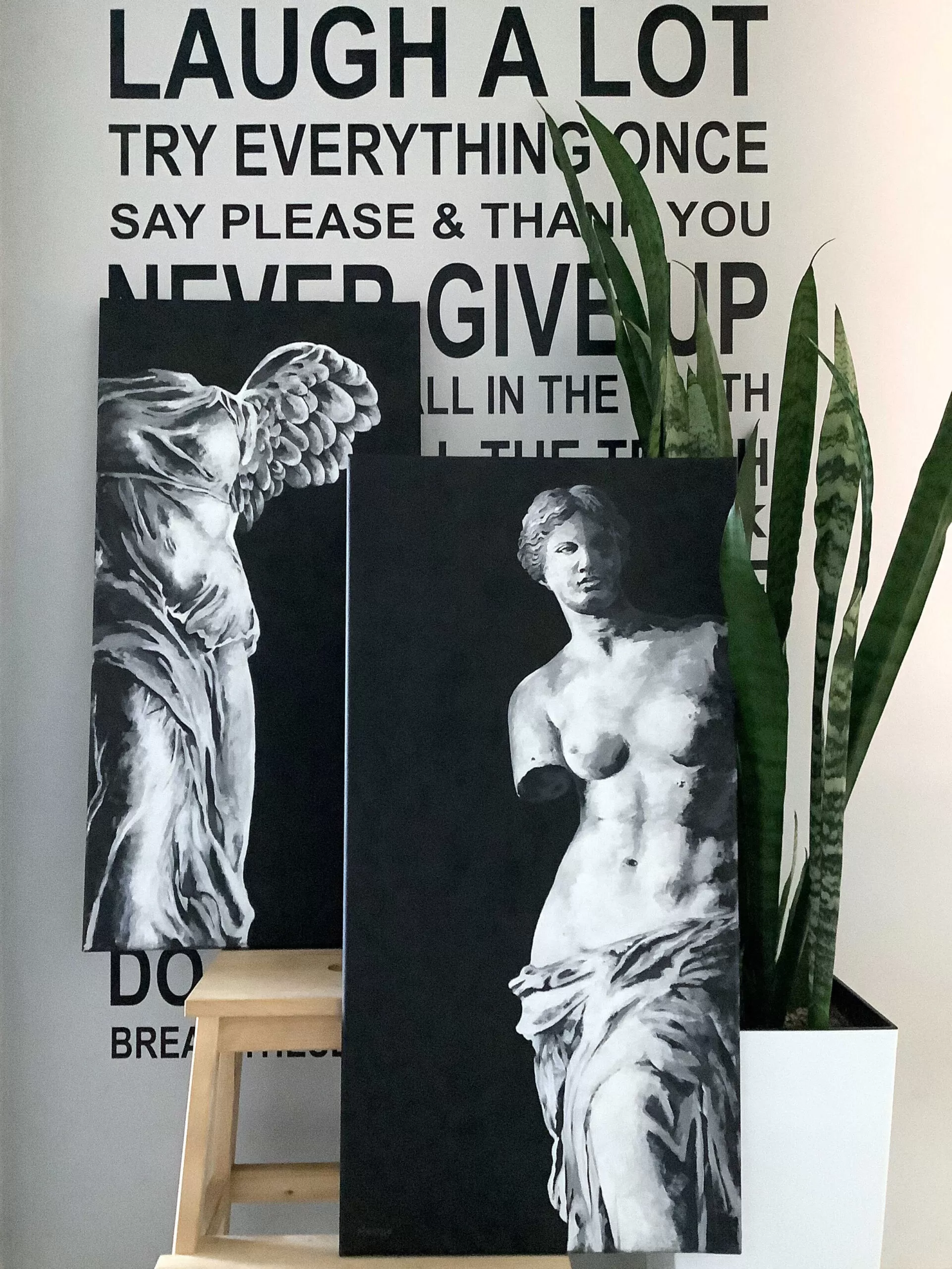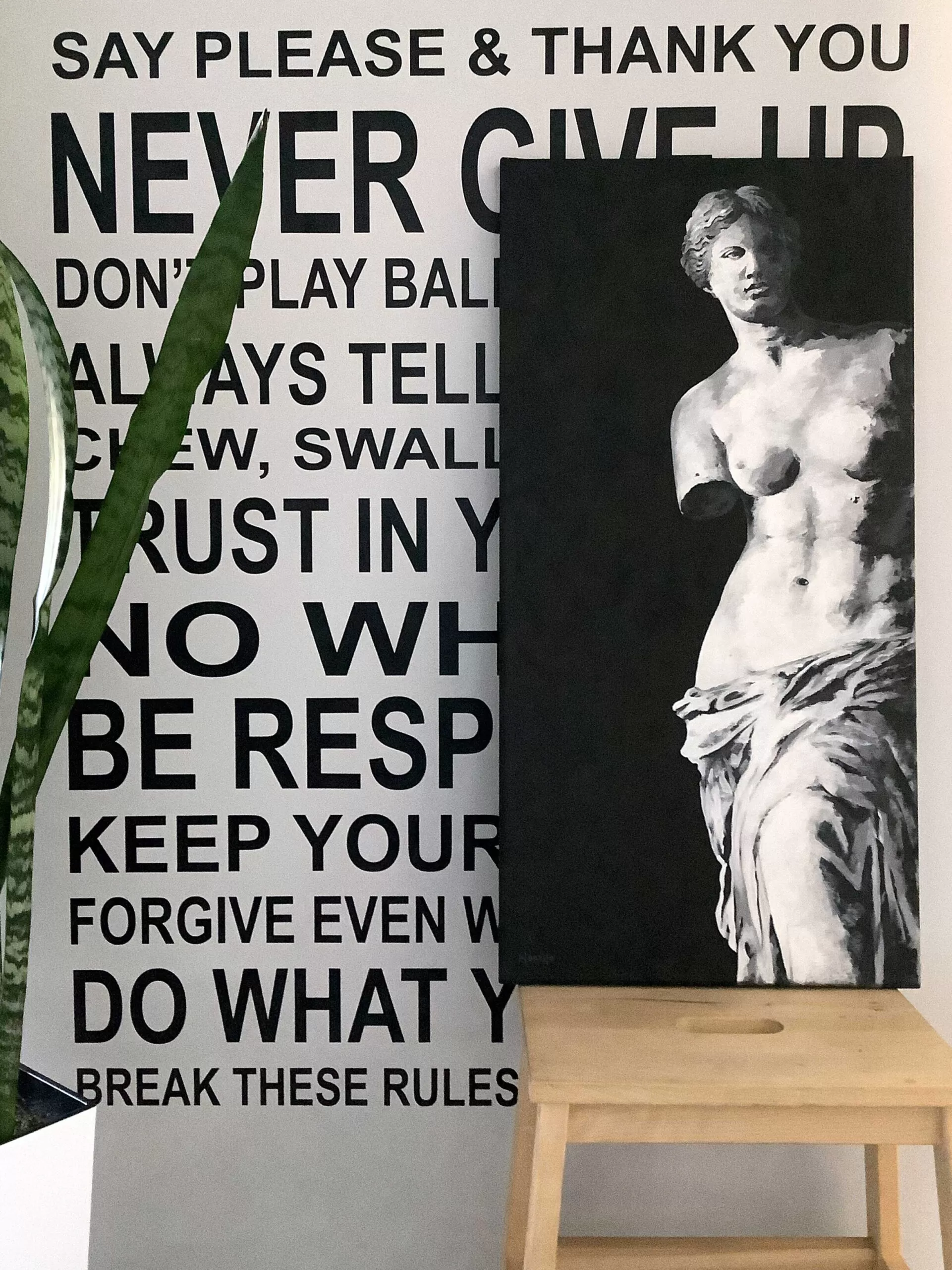 “Wenus z Milo” z cyklu “Color Interiors”. Obraz namalowany akrylem na płótnie, techniki własne. Farba nakładana warstwowo. Całość pokryta werniksem damarowym półmat.