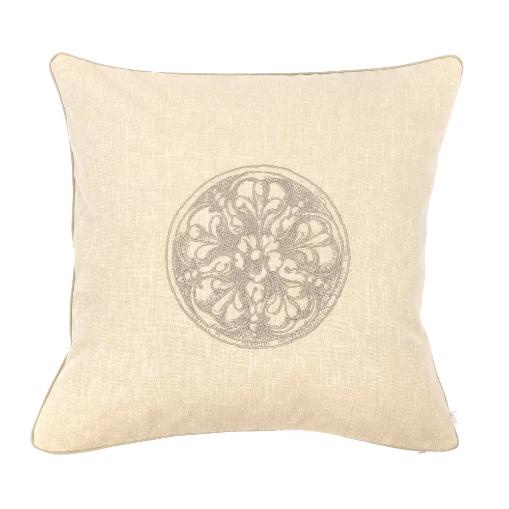 Poduszka dekoracyjna z limitowanej kolekcji ARCHITECTURE MAJA LAPTOS STUDIO, zainspirowanej architekturą, z beżowym haftem ozdobnej rozety, stworzona została w oparciu o starą rycinę. Ozdobny haft rozetki ozdobi wnętrza klasyczne i nowoczesne, i doda im ponadczasowego charakteru.