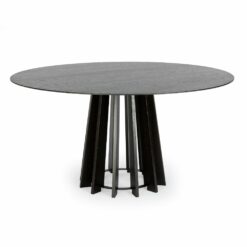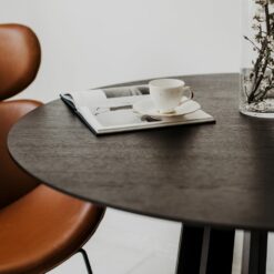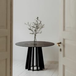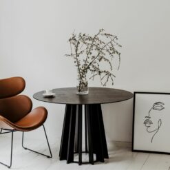 Solidny i elegancki stół wykonany z najwyższej jakości materiałów. Blat pokryty fornirem dębowym, osadzony na podstawie wykonanej z litego dębu i malowanej proszkowo metalowej obręczy. Stół dostępny o średnicy 120 i 140 cm. Stół jest nierozkładany.