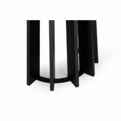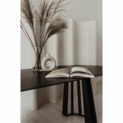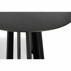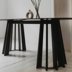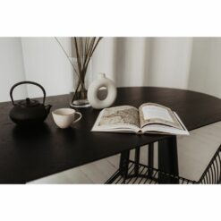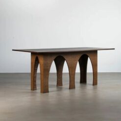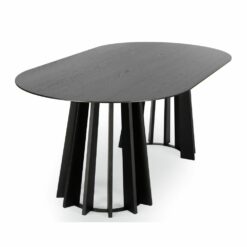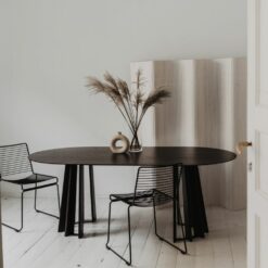Masywny owalny stół wykonany z najwyższej jakości materiałów. Blat pokryty fornirem dębowym, osadzony na dwóch nogach wykonanych z litego dębu, wzmocnionych metalowymi łukami malowanymi proszkowo. Stół jest nierozkładany.