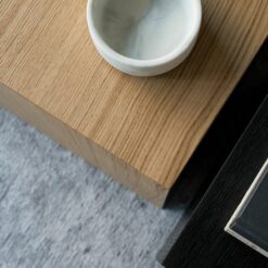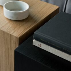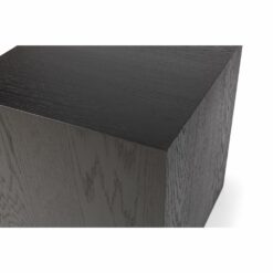 Blat i boki wykonane są z wysokiej jakości forniru dębowego. Mniejszy stolik dostępny jest w rozmiarze: 38 cm x 38 cm, wys. 38 cm, a większy w rozmiarze: 50 cm x 50 cm, wys. 50 cm. Warianty kolorystyczne: naturalny, czarny.