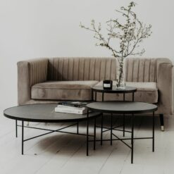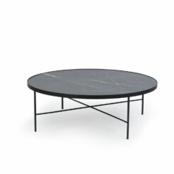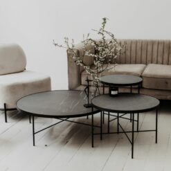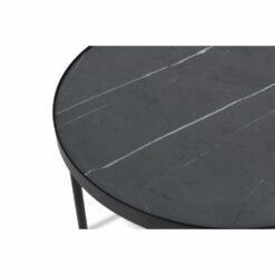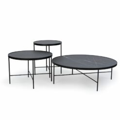Eleganckie stoliki TRE, blat wykonany z wysokiej jakości laminatu HPL, który odzwierciedla strukturę marmuru Pietra Grey. Stelaż malowany proszkowo RAL 9005.