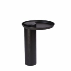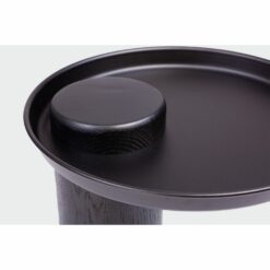 Masywna noga wykonana jest z litego drewna dębowego, a blat z metalowej tacy.