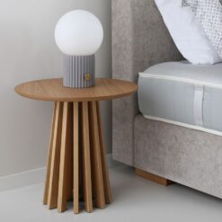 Solidny i elegancki stolik wykonany z najwyższej jakości materiałów. Blat dostępny w dwóch wersjach: lite drewno dębowe lub fornir dębowy. Postawa wykonana z 20 pojedynczych elementów z litego drewna