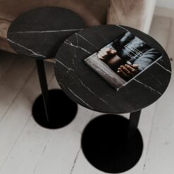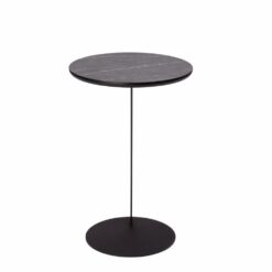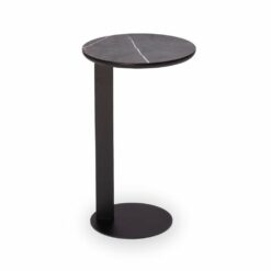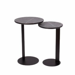 Seria stolików pomocniczych, podstawa stolika jest delikatna, ale stabilna. Czarna metalowa noga jest malowana proszkowo i wspiera blat wykonany z płyty HPL i pokryty laminatem imitująca czarny marmur.