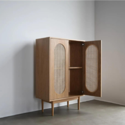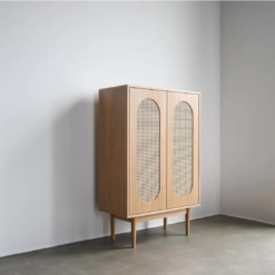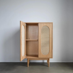 Highboard Moon to mebel, który łączy funkcjonalność przechowywania z przyjemnym wyglądem naturalnego rattanu. Ma dwie drzwi, które umożliwiają łatwy dostęp do wnętrza szafy. Drzwi wykonane są z połączenia drewna, forniru dębowego oraz rattanu.
