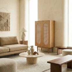 Highboard Moon to mebel, który łączy funkcjonalność przechowywania z przyjemnym wyglądem naturalnego rattanu. Ma dwie drzwi, które umożliwiają łatwy dostęp do wnętrza szafy. Drzwi wykonane są z połączenia drewna, forniru dębowego oraz rattanu.