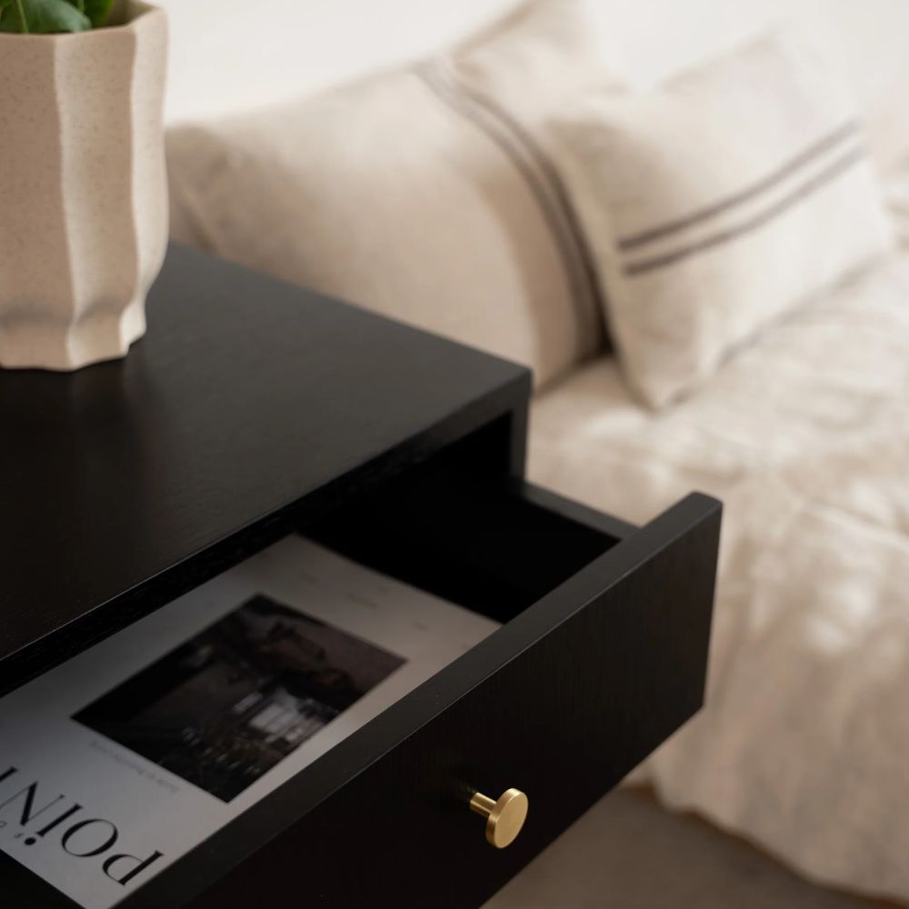 Szafka nocna BLACKIE+ łączy kompaktową formę z eleganckimi detalami, tworząc mebel, który subtelnie podkreśla charakter sypialni. Dwie pojemne szuflady z ozdobnymi, mosiężnymi gałkami zapewniają wygodne miejsce na wszystkie niezbędne drobiazgi, a smukłe, lekko zwężane nóżki nadają jej lekkości i harmonii.