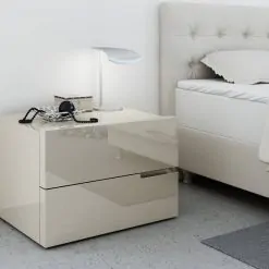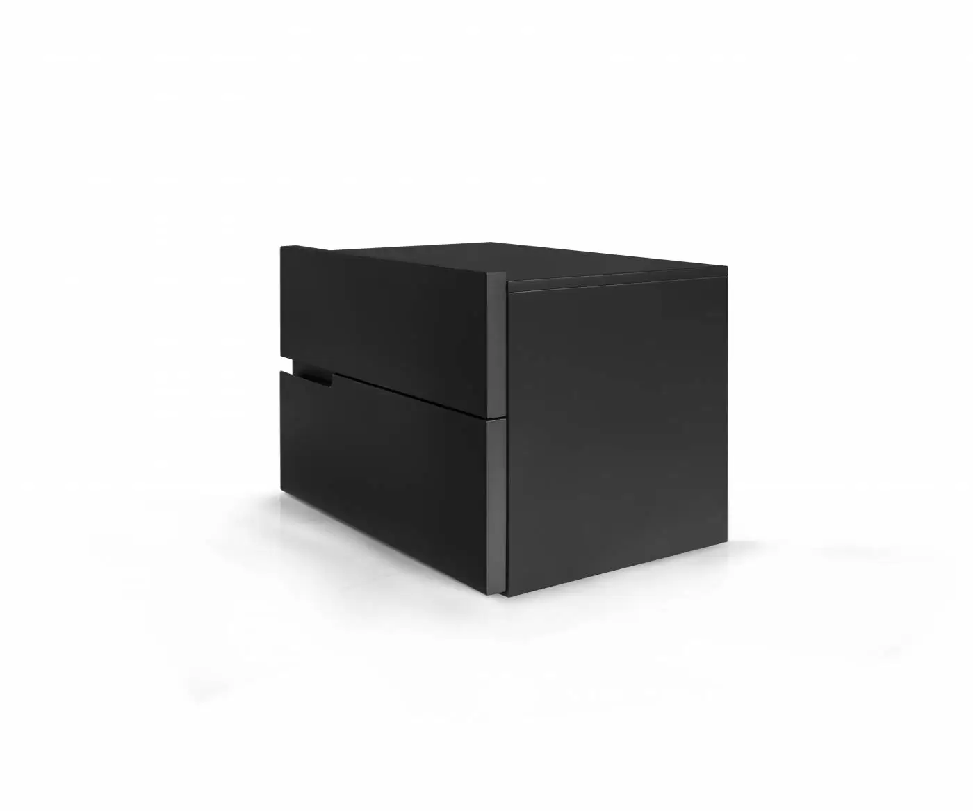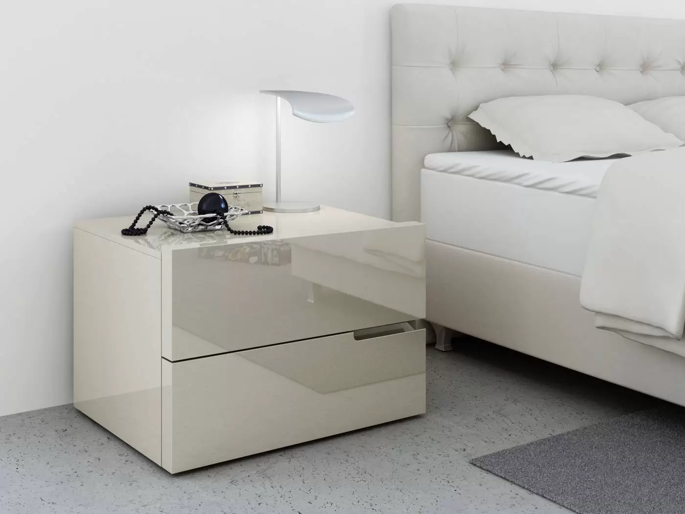 Szafka nocna GLORIA to elegancki i funkcjonalny mebel wyposażony w dwie duże szuflady z frezowanymi uchwytami. Ciekawy kształt frontów sprawia, że idealnie sprawdzi się ona w sypialni o nowoczesnym charakterze. Do jej stworzenia użyto najlepszych włoskich lakierów oraz wysokiej jakości prowadnic z opcją samodomykania. Klienci mogą wybierać spośród wielu dostępnych kolorów oraz dwóch wersji wykończenia – matowej lub lakierowanej na wysoki połysk.