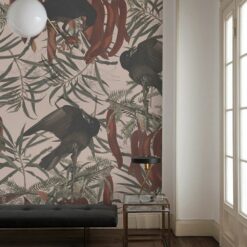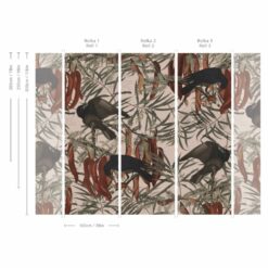 Tapeta z botaniczną kompozycją zaprojektowaną w stylu vintage. Realistyczny projekt przedstawia wrony, siedzące na gałązkach, a cały wzór umiejscowiony jest na tle w kolorze brudnego różu, tworząc interesującą teksturę. W ofercie dostępne również inne wersje kolorystyczne.