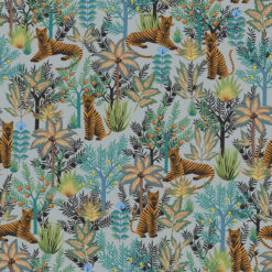 Tapeta Gold Tigers Light Blue to wyrazista i żywa dekoracja ścienna, która łączy jasnoniebieskie tło z dynamicznymi wzorami złotych tygrysów oraz bujnej roślinności. Ta tapeta wprowadza do wnętrza odświeżający akcent, idealnie nadaje się do nowoczesnych sypialni, kreatywnych przestrzeni oraz stylowych salonów. Połączenie intensywnych motywów z jasną kolorystyką sprawia, że wnętrze staje się pełne energii i inspiracji.
