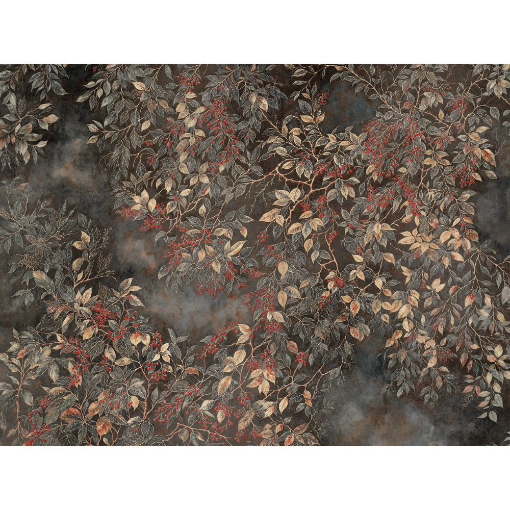 Tapeta Grisali to hołd dla natury w jej tajemniczym, nastrojowym wydaniu. Głębokie tło i misternie rysowane gałęzie z czerwonymi jagodami tworzą zmysłową kompozycję, która dodaje wnętrzom głębi, charakteru i artystycznego klimatu.