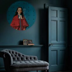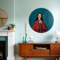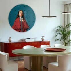 Dots Girl in Red to odważna dekoracja ścienna w formie okrągłej kompozycji, przedstawiająca dziewczynę w intensywnie czerwonym stroju na stonowanym tle. Portret emanuje siłą i elegancją, przyciągając uwagę minimalistyczną formą i mocnym kolorem. Idealna propozycja do wnętrz z charakterem.