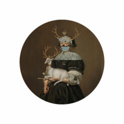 Dots Lady of the Stag to dekoracja ścienna w formie koła, ukazująca symboliczną scenę kobiety i jelenia w leśnym pejzażu. Kompozycja inspirowana sztuką kolażu i estetyką baśni tworzy atmosferę tajemnicy i wewnętrznej siły. Idealna do wnętrz z duszą: sypialni, pracowni, salonu lub artystycznej przestrzeni.