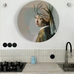Dots Nature Girl with the Pearl to dekoracja w formie koła, inspirowana klasycznym portretem “Dziewczyny z perłą” Vermeera, wkomponowanym w naturalne, zielone otoczenie. Wzór harmonijnie łączy elementy natury i sztuki, tworząc elegancki akcent do nowoczesnych wnętrz.