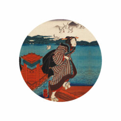 Dots The Red Departure to dekoracja ścienna w formie koła, inspirowana japońskim drzeworytem ukiyo-e, przedstawiająca kobietę stojącą na pomoście w momencie pożegnania lub wewnętrznej decyzji. Intensywna kolorystyka zdominowana przez czerwień i błękit oraz symboliczny lot ptaków nadają tej scenie melancholijnego piękna. Idealna do wnętrz, które cenią sztukę z historią i emocją.
