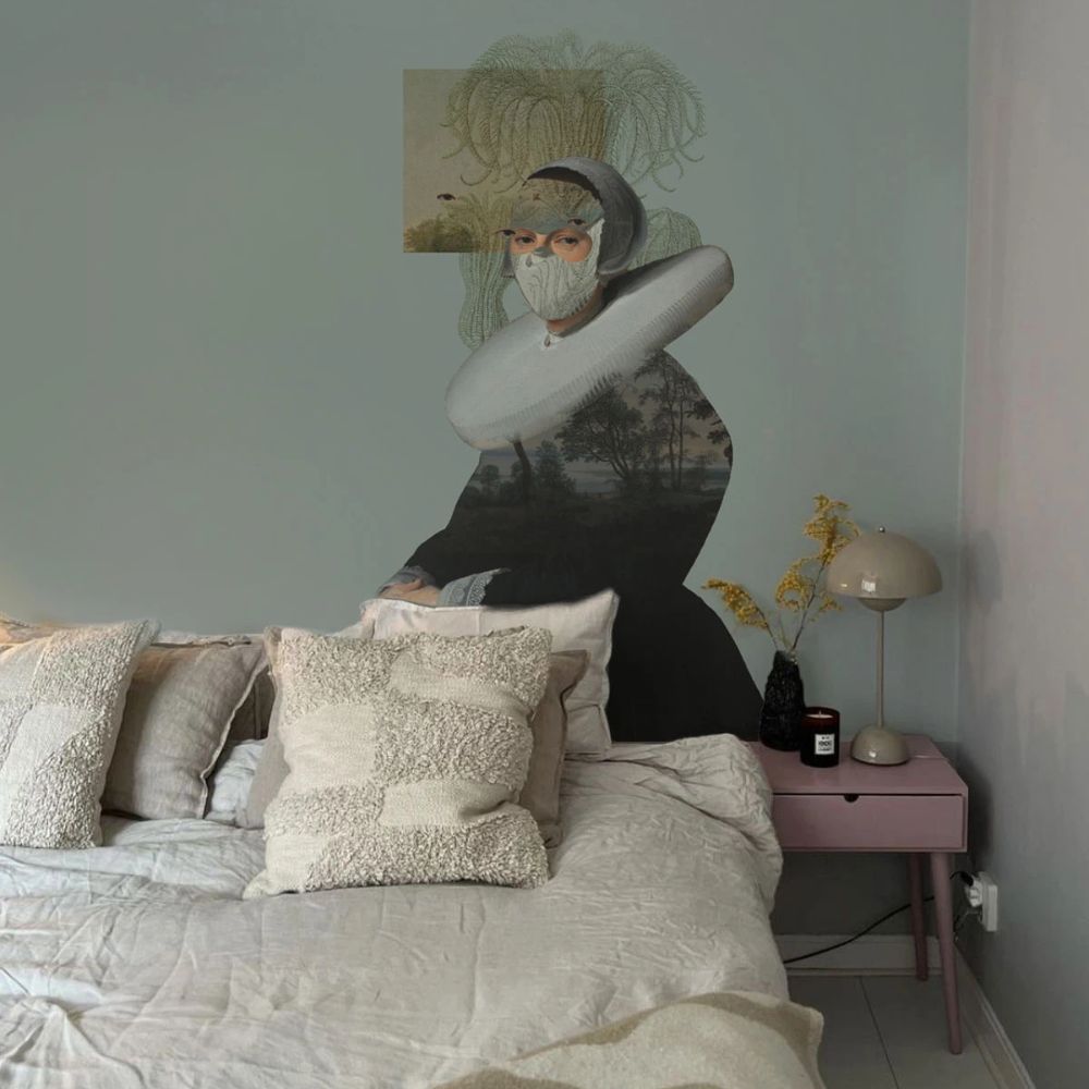 Tapeta Landscape Muse Green to intrygujące połączenie klasycznego portretu z bujnym pejzażem, zamknięte w formie artystycznego kolażu. Odcienie zieleni i beżu tworzą harmonijną, ale pełną charakteru dekorację, która subtelnie ożywia przestrzeń. Idealna do kuchni, jadalni, salonu czy domowego biura – wszędzie tam, gdzie sztuka spotyka codzienność.