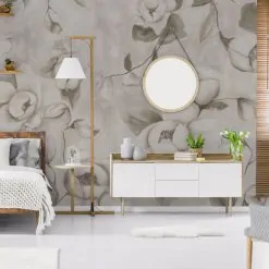 Tapeta Wisteria to delikatny motyw kwiatowy w odcieniach chłodnego beżu, naniesiony niczym tatuaż na strukturę tynku. Idealne uzupełnienie aranżacji w małych wnętrzach, pasuje do stylu loftowego, minimalistycznego , nowoczesnego skandynawskiego.